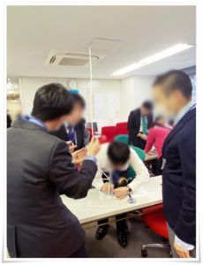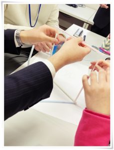 3〜4人1組でグループを作り、その仲間と協力して目標に向かってワークをしました。