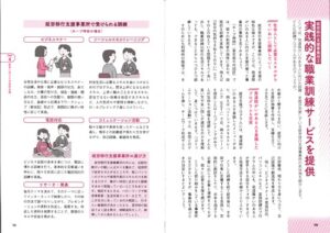 HOPE神田を例にとって「就職から定着までをトータルに支援」として就労移行支援事業所の機能が紹介され、また、「実践的な職業訓練サービスを提供」としてHOPE神田のSSTやコミュニケーション活動などの取り組みが、発たつ障害のある人に向けた訓練・支援が充実している具体例として紹介されています。