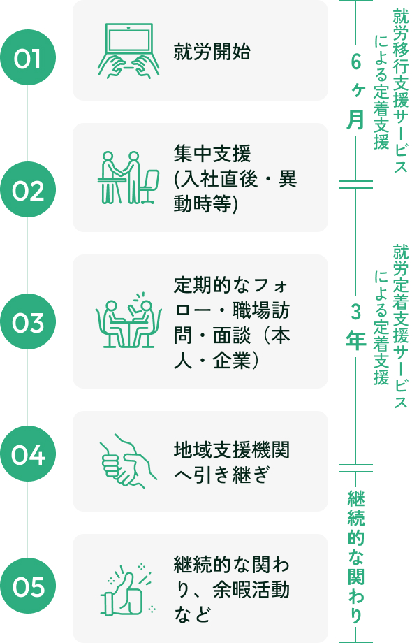 就労開始日から、HOPE神田の就労支援員が職場訪問などの定着支援を開始します。通常の定着支援は6か月ですが、当事業所は就労定着支援サービスも併設しているため、7か月目以降はさらに3年間、ワンストップで定着支援をご提供しています。
